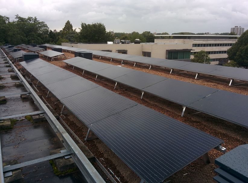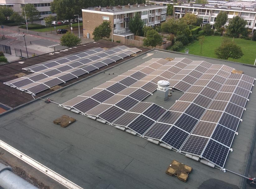 Advies, selectie en installatie voor een 140kW zonnepanelensysteem op een schoolgebouw.